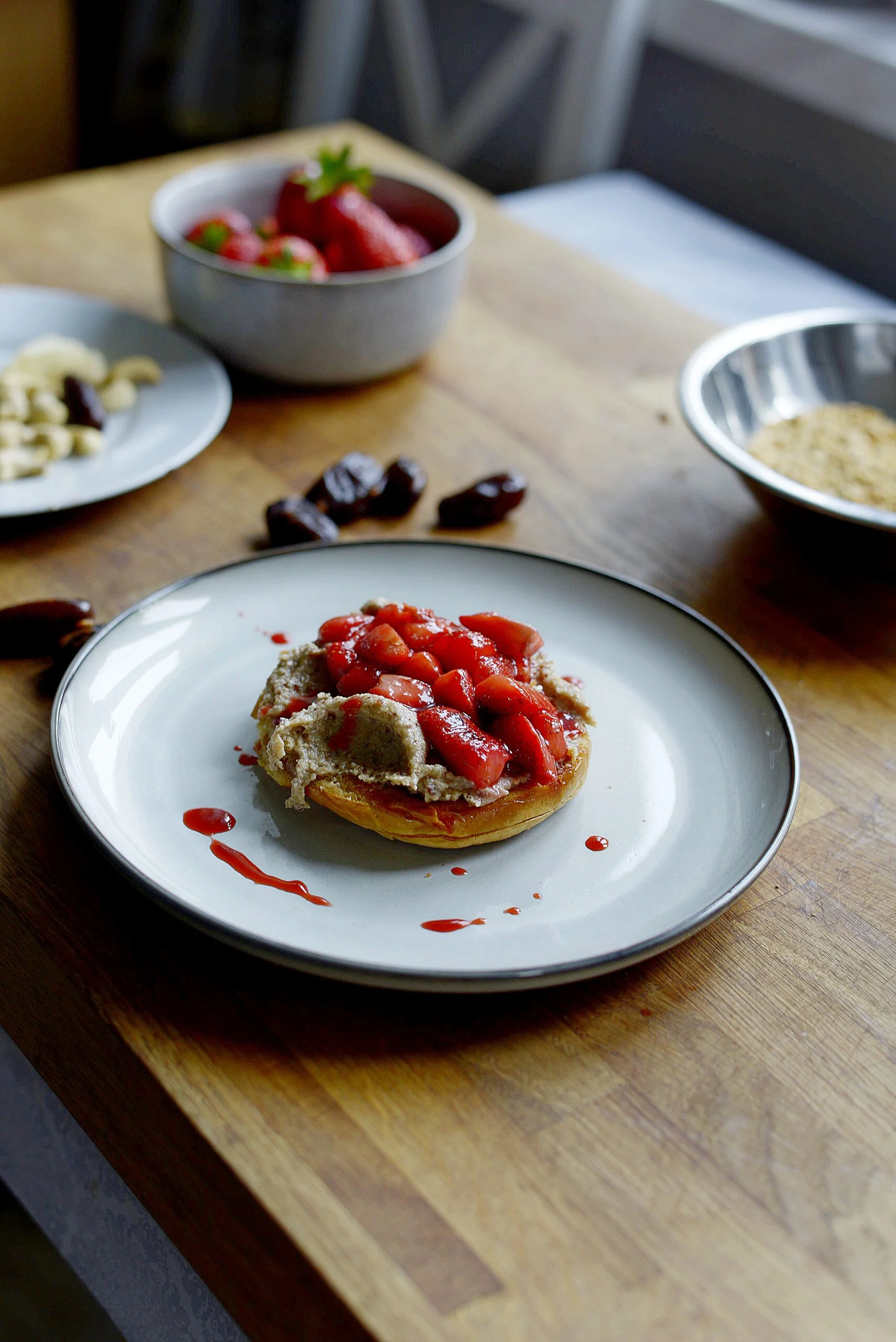 Bułka maślana z pastą z nerkowców i daktyli z truskawkami
