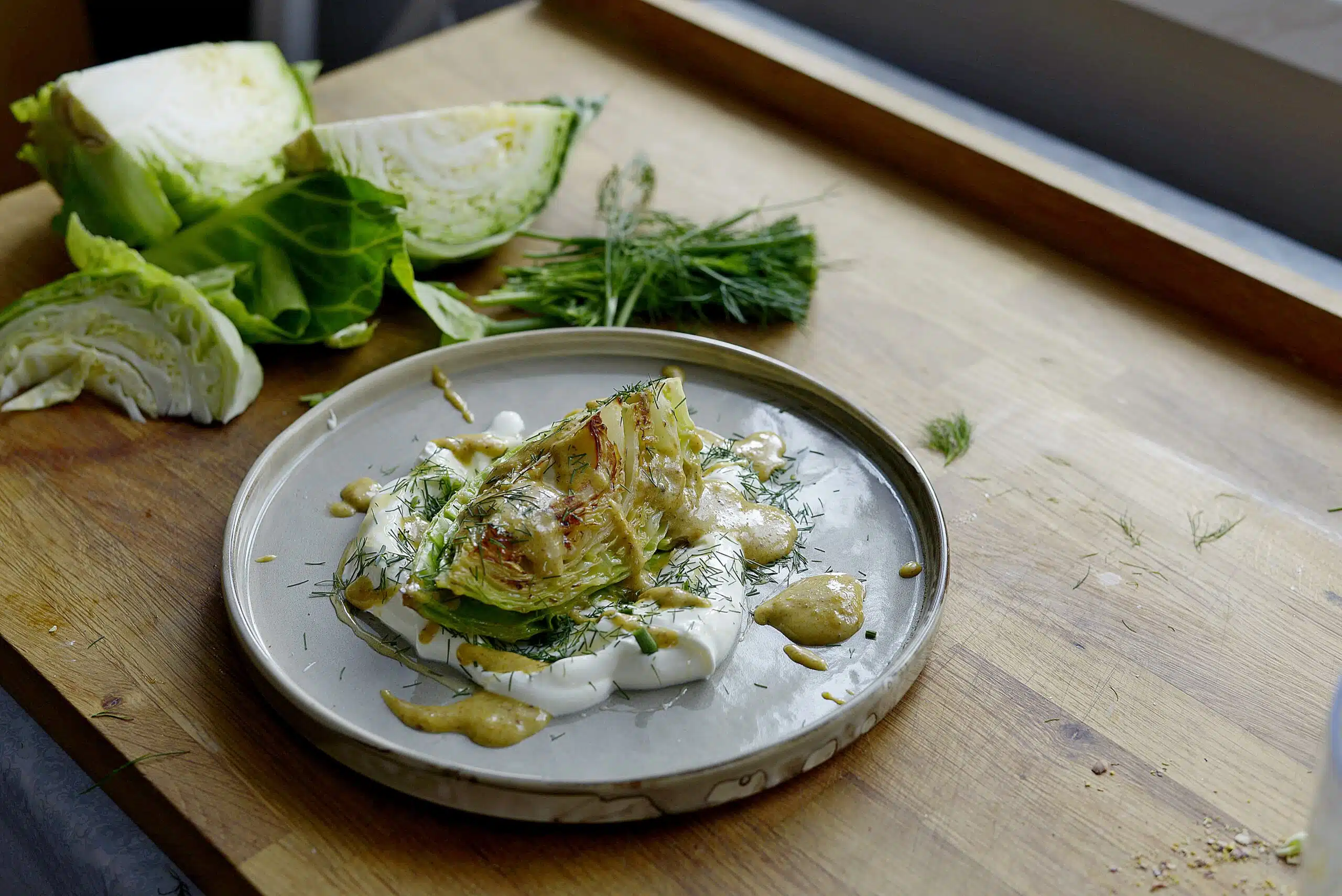 Smażona młoda kapusta z pastą z pistacji i tahini